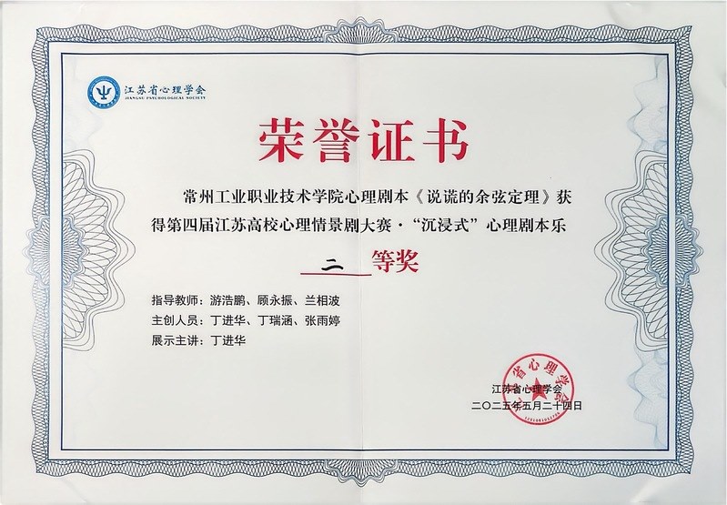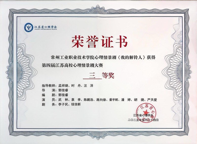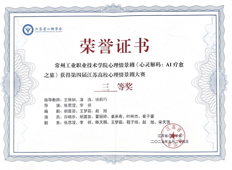 近日,由江蘇省心理學會藝(yì)術心理輔導員與治療專(zhuān)業委員會主辦的第二屆(jiè)江蘇省(shěng)高校心理情景劇大賽(sài)決(jué)賽在鹽城師範學院舉行。由常州工業(yè)職業技術學院(yuàn)推(tuī)薦的心理(lǐ)劇本《說謊的餘弦定理》從全省(shěng)97個參賽(sài)作品中脫穎而出(chū),榮獲二等獎;同時,學校推薦的心理情景劇作品《心靈解碼:AI療愈之旅》和《我的解鈴人》也從全省140個參賽作品中脫穎而出,均榮獲三等獎。遊浩鵬、王姝嫻、孟祥婕等9位老(lǎo)師被評為大賽優秀指導老(lǎo)師。