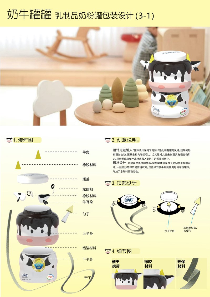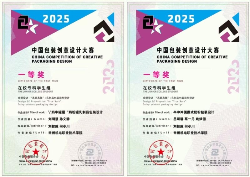 8月25日,中國包裝創意設計大賽落(luò)幕。由常州機電職業技術(shù)學院創意設計學(xué)院(yuàn)劉智(zhì)威、何小川(chuān)、孫寧老師指導,劉明慧、孫文靜創作的《“奶牛罐罐(guàn)”奶粉罐乳製品包裝設計》,呂可馨、葛一丹、姚夢(mèng)圓創(chuàng)作的《牛衝衝便攜(xié)式奶(nǎi)粉(fěn)包裝設計(jì)》榮獲全國一(yī)等(děng)獎。此外,命題(tí)設計作品獲二等獎1項及5000元獎金,另有多組(zǔ)作品分獲三等獎和優秀獎。