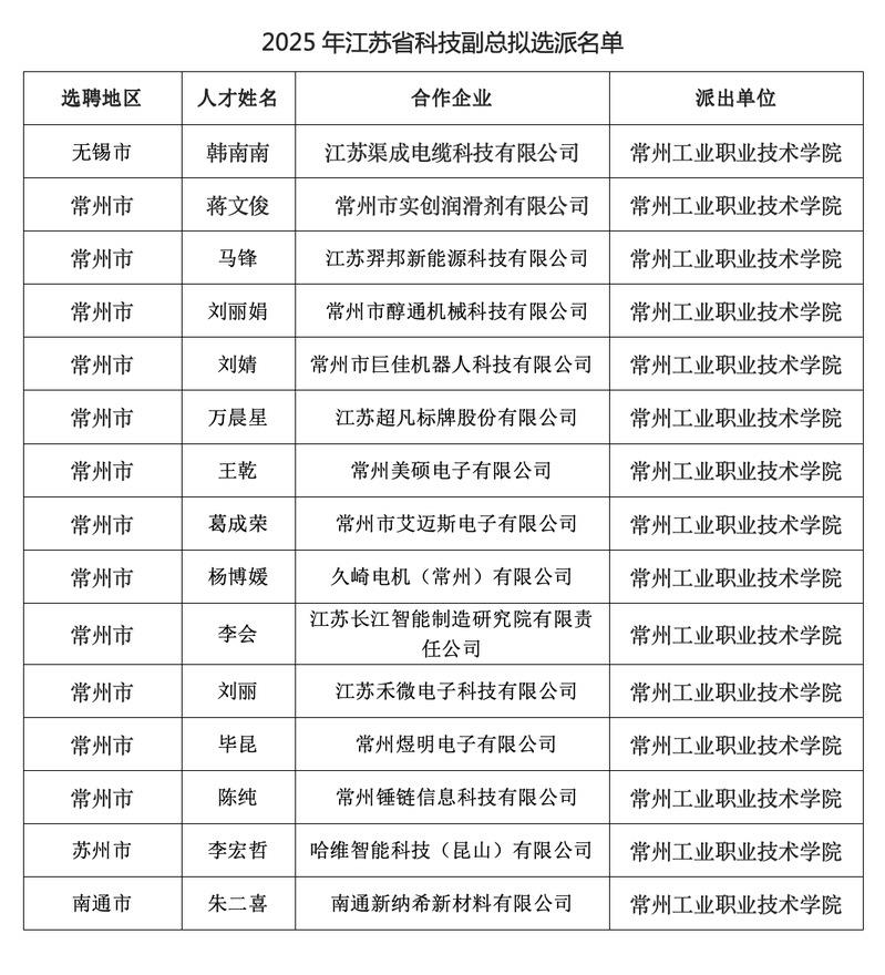 日前(qián),江蘇省科技廳(tīng)對2025年江蘇省科技副總項目(mù)擬入選對象進行公示。本次(cì)共有來自國內高校院所的2333人入選,?常州工業職業技術學院韓南南等15名教師成功入選(xuǎn)?,入選人數(shù)再創新高。