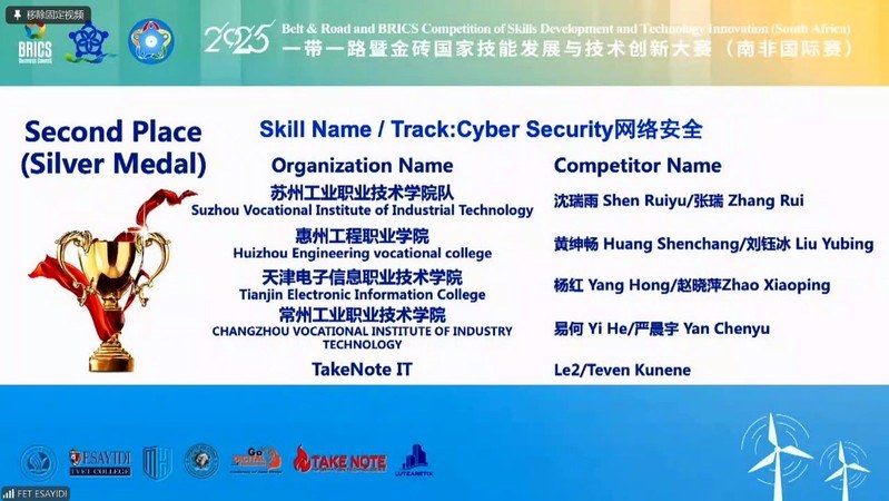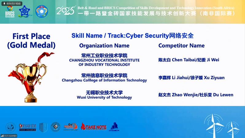 8月26日,2025金磚國家技能發展與技術創(chuàng)新(xīn)大賽“網絡安全”賽項圓滿落幕,常州工業職業技術(shù)學院信息工程學院(yuàn)學生在比賽中表現(xiàn)卓越,一(yī)舉斬獲金獎一項、銀獎一項,為學校爭得榮譽。