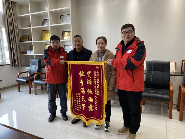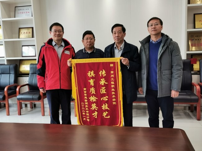 得到大賽獲(huò)獎的消息,紀書寧和徐彬彬第一時間向學院專業老師和班主任老師發來了喜訊。南京華建檢(jiǎn)測技術有限公司總經理胡(hú)斌定、總工程師孔元元於1月(yuè)4日特地向學(xué)校送來喜(xǐ)報和錦旗。學校黨委委員、副校長施福新,智造學院院長周皞、黨總支副(fù)書(shū)記管丹、理化測試與質檢技術專業帶頭(tóu)人張亮、專業教師任衛東參加了活動。