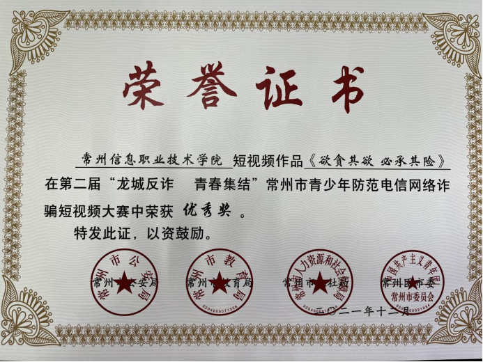 日前(qián),第二屆(jiè)“龍(lóng)城反詐,青春集結”常州市青少年防範電信網絡詐騙短視(shì)頻大賽頒獎暨“龍城校園(yuán)反詐聯盟”成立(lì)儀式在市公安(ān)局落下了帷幕。我校選送的8部短視頻作品在大賽中獲得優異成績,我校榮獲優秀組織獎。軟件與大數據學院(yuàn)分團(tuán)委選送的《雙卡詐騙》作品獲得大賽二等獎,電子工(gōng)程學(xué)院分(fèn)團委(wěi)選送的《不上你的(de)當》《線(xiàn)下無賊》以(yǐ)及數字經濟學院分團委選送的《欲貪其欲,必承(chéng)其險》3部作品獲(huò)得大賽優秀(xiù)獎。