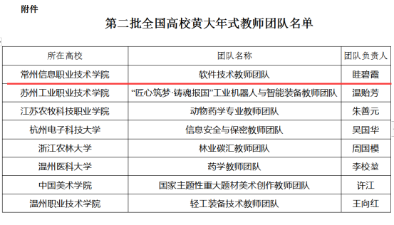 近日,教育部印發通知,公布第二批(pī)全國高校黃大年式教師團隊,常州(zhōu)信息職(zhí)業技術(shù)學(xué)院的校長眭碧霞教授領銜的“軟件技術教師團隊(duì)”成(chéng)功入選。