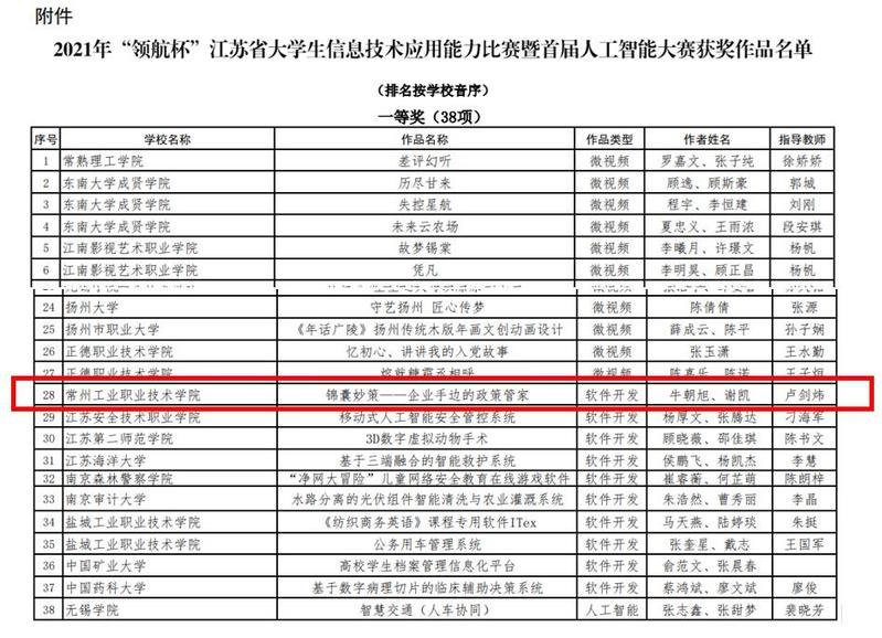 常州工業(yè)職業技術學院榮獲2021年江蘇省大學生信息技術應用能力比賽(sài)暨首屆人工智能大賽(sài)一等獎