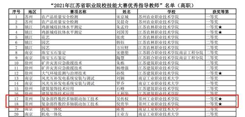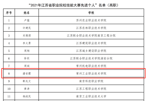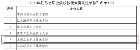 近日(rì),江蘇省職業院校技能大賽組委會發布了《關於表彰 2021 年全國及全省職業院校(xiào)技能大賽先進單位和先進個人的(de)決(jué)定》,對在2021年度全國、全省職業院校技能大賽中取得優異成績(jì)的選手、指導教師(shī),作出突出貢獻的單位和個人予(yǔ)以表彰(zhāng)。常(cháng)州工業職業技術學院3名學生被(bèi)授予“學生技能標兵”稱號、5名教師被授予“優秀指導教師”稱號,1名教師被授予“先進(jìn)個人”稱號,學校被(bèi)授予“先進單位獎”稱號。