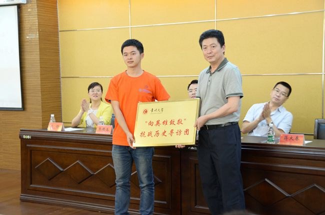 常州市檔案局副局長(zhǎng)蔣大春為“向英雄致敬”常州大學抗戰曆(lì)史尋訪團授牌