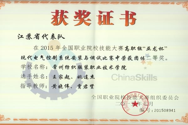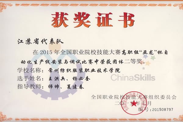 7月2日-7月3日在(zài)天津(jīn)中德(dé)職業技術學院舉辦的2015年全國高等職業院校技能大賽“亞龍(lóng)”杯自動化生產線安裝與調試賽項中,我院師帥、夏(xià)建春老師指導的王洪兵、楊(yáng)必奎兩(liǎng)位(wèi)學生榮獲該(gāi)項目團體二等獎(jiǎng)。