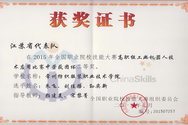 6月29日—7月4日,2015全國職業院校技能大賽高職組工業(yè)機器人應用技術賽項在天津現代職業技(jì)術學院舉行。我院宋黎菁、顏建美老師指導的孫奕新、劉(liú)佳路和朱飛同學在緊張激烈(liè)的(de)2天比賽中,從全國36支參賽隊中脫穎而出,以總分(fèn)98分、排(pái)名第六的好成績榮獲團體二(èr)等(děng)獎。
