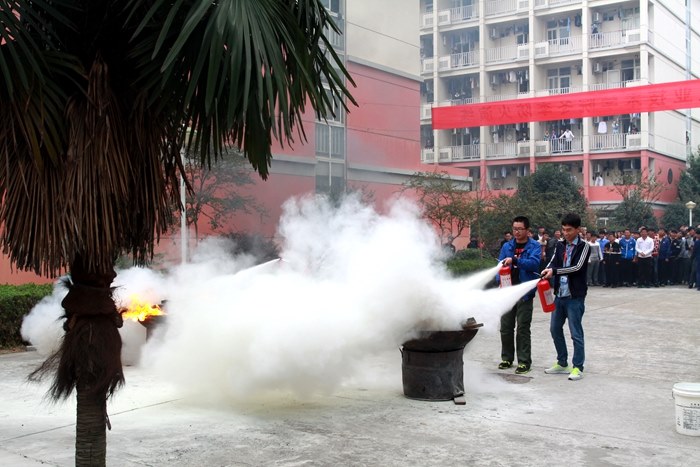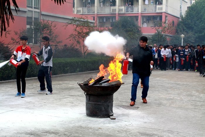 疏散演練之後,緊接(jiē)著進行的是對初起火災的撲滅(miè)演練。現場燃起四堆大火。來自全院八個係百餘名同學,在保衛處葉鴻源老師的示範下進行了滅火演練。大家個(gè)個身手不凡(fán),手(shǒu)提幹粉滅火器,疾步衝向(xiàng)火堆,拔出(chū)滅火器保險銷,對準火堆根部,用力按下壓把,瞬間便撲滅了大火,演練場(chǎng)區頓時“狼煙四起”。至此,我(wǒ)院秋冬季消防應急疏(shū)散(sàn)及滅火演練圓滿落(luò)幕。