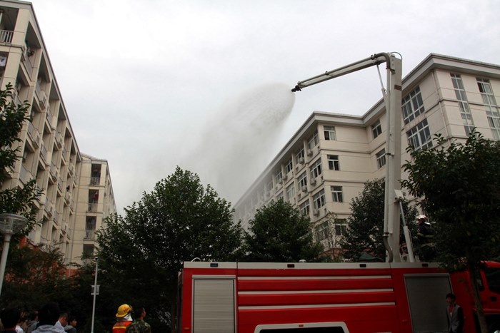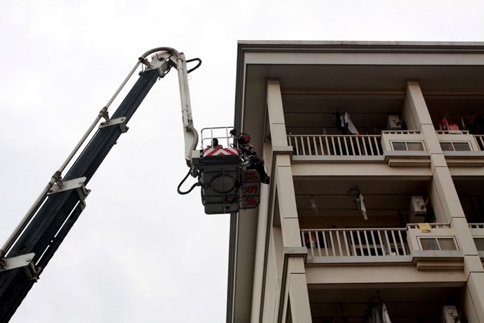 下午兩點,消防疏(shū)散演練正(zhèng)式開(kāi)始。一聲急促而淒厲的火情警報聲劃破天空,7號公寓一層(céng)冒出濃煙。住在7號公寓(yù)的女生們聞訊後,立即用濕毛巾捂住口鼻,快速有(yǒu)序地從消防通道進行逃生。曆時約6分鍾,大部分同學已逃離發生火情的7號公寓。但學生(shēng)中有人報告,有同學在逃生過程中不幸絆倒,還被困在樓裏。聞訊後,兩名保安帶著擔架,立即奔向濃煙滾滾的樓內,迅速地將傷(shāng)員抬出,衛生所醫護人員對受傷人(rén)員(yuán)進(jìn)行了診治。正當輔導員老師對疏散人員進行清點之際,突(tū)然在7棟公寓6樓(lóu)西南角的宿舍有人呼救,原來還有1名同學(xué)被困宿(xiǔ)舍,正焦急地等待著消防官兵的搭救。於是,武進(jìn)區消防大隊的武警(jǐng)官兵們迅速亮出其看家武器(qì)——雲梯。雲梯在消防(fáng)員的操控下(xià),緩緩伸出長(zhǎng)臂,慢慢地向受困學生所在陽台接近。這名同學在消防員的協助下,小心翼翼地跨越陽台的欄杆,鑽進雲梯(tī)的觀察哨裏。這時,下麵圍觀的師生終於放下了懸著的一顆心,長長地舒了一口氣。當雲梯穩穩地將這兩名同學送到(dào)地麵時,人群中(zhōng)有掌聲響起。隨後,消防(fáng)武警官兵們還對(duì)火點進(jìn)行了噴水滅火的演示。師生們興味盎然地觀(guān)看了演示(shì)。