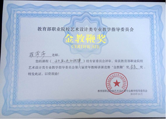 11月7日(rì)-8日,教育部職業院校藝(yì)術設(shè)計類(lèi)專業(yè)教學指(zhǐ)導委員會第九屆院長/係主任工作年會期間舉行(háng)了第六(liù)屆青年教師講課競賽和第八屆優秀畢業設計競賽。我院羅莎莎老師的課程(chéng)《動畫運動規律(lǜ)》獲“金教鞭(biān)”銀獎;於玉鳳、惠萌、丁舒同學的畢業設計作品(pǐn)《90後愛情觀(guān)》獲優(yōu)秀設計獎銅獎。