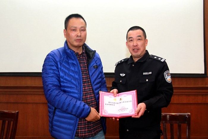 毛伯民副院(yuàn)長授予仇(chóu)文獻所長“校園法製輔導員”聘書