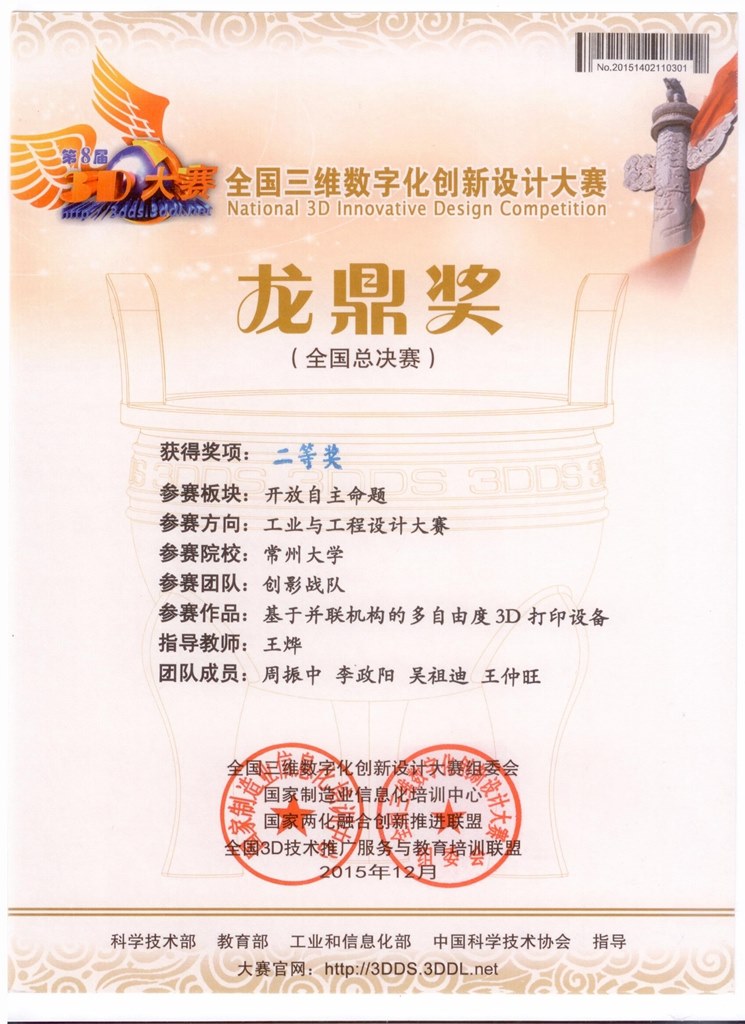 12月6日,經過初賽、決賽、再到總決賽,曆時9個月的“3D圈圈杯”第8屆全國3D大賽暨3D大會在江蘇省常州市科教城圓滿(mǎn)落(luò)幕。我校(xiào)師生在本屆大賽中表現出色,由劉善淑、胡(hú)愛萍老師(shī)指導,周振中、金義、黃董婉(wǎn)、吳祖迪等同學的作品“三板書麵避粉塵(chén)自(zì)動擦的(de)黑板(bǎn)”獲工業與工程設計(jì)項目全國(guó)一等獎(省(shěng)內僅(jǐn)有五所高校獲得一等獎(jiǎng)),由鄒旻、王燁老師指(zhǐ)導,姬效印、吳加鏡、徐進(jìn)超、吳(wú)偉唯等同學的作品“基(jī)於機械原理的滾球式綜合演示教具”和由(yóu)王燁老師指導,周振中、李(lǐ)政(zhèng)陽、吳祖迪、王仲旺等同學的作品(pǐn)“基(jī)於並(bìng)聯機構的(de)多自由度3D打印設備”分(fèn)獲3D打(dǎ)印創新設計項目、工業與工程設計項目全國二等獎。此外,機電131班(bān)周振中同學榮獲騰訊公司頒發的“科普創客·3D達人”稱號。