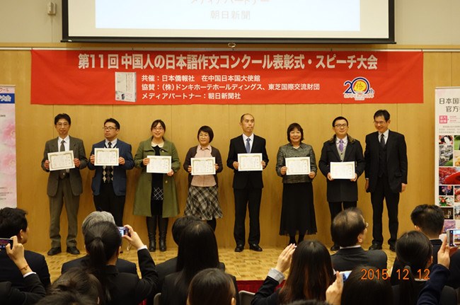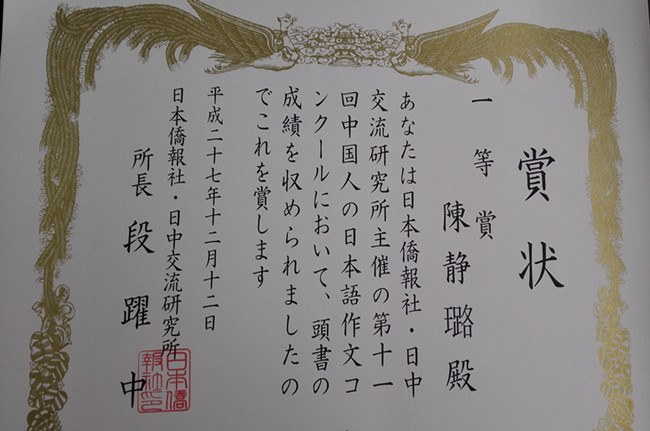 11月底,“第十一屆中國人日語作文大賽”獲獎揭曉(xiǎo),我校周有光語言文化學院日語係陳靜璐同學榮獲本屆大賽一等(děng)獎,王(wáng)佳歡同學榮獲佳作獎,陳林俊(jun4)老師與古田島和美老師榮獲優秀指導教師獎,並(bìng)被(bèi)聘任為大賽推廣大使。