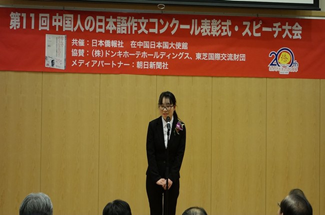 近(jìn)日,大賽(sài)頒獎典禮在北京日本大使館舉行,一等獎獲得者陳靜(jìng)璐同學代表獲獎選手在頒獎典禮上發表了演講,古田島老師代(dài)表獲獎(jiǎng)教(jiāo)師(shī)介紹了指導經驗。