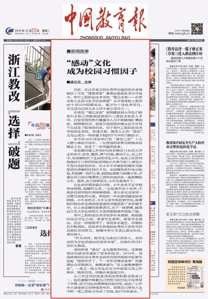 12月22日,《中國教育報》以“常州(zhōu)工程職技院:感動文化成為校園習慣‘因子(zǐ)’”為題,對我院近年來以“感動文化”這一特色工作為抓手,著力推進(jìn)校園文(wén)化建設(shè)創新工作,進行了重點挖掘和(hé)深度(dù)報道。