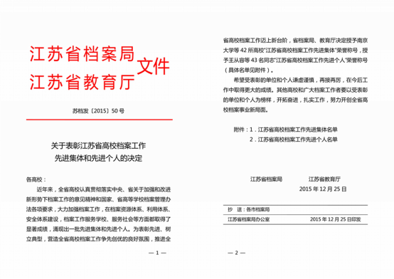 2015年12月25日,江蘇省(shěng)檔案局、江蘇省教育廳聯合發文,對在高校檔案(àn)資源體係、利用體係、安全體係建設及(jí)檔(dàng)案工(gōng)作服務學校等方麵做出顯著成績的集體和個人進行了表彰。我院被評為全(quán)省(shěng)高校檔案工作先進集體,孫文靖老師榮獲全省高校檔案工作先進個人榮譽稱號。