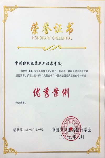 為推動紡織服裝產業研究、推動產教融合(hé)、推進校(xiào)企合作,中國紡織服(fú)裝教(jiāo)育學會聯合中國紡織工業企業管理協會開展了2015“鳳凰(huáng)莊杯”中國紡織服裝產業研究優秀成果評選和校企合作專業優秀案例評選。我院服裝(zhuāng)專業(合作企業:紅豆、華利(lì)達、晨風(fēng))申報的《建(jiàn)構(gòu)“對接服裝智(zhì)造崗位”的(de)現代學徒製人才培(péi)養範式實(shí)踐》建設卓有成效,經(jīng)過評審,榮獲:2015年(nián)“鳳凰莊杯”中國紡織服裝產業校企合作專業優秀案例,排名第二(èr)。
