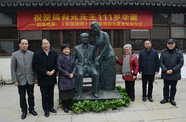 慶(qìng)祝活動中周老夫婦(fù)銅像落成揭幕,新(xīn)書《111歲如是我聞》首發和周有光獎學金(jīn)頒(bān)獎。市領導(dǎo)、周老家(jiā)屬及常州大學領導分別致辭。市領導張躍高度評價(jià)了周老先(xiān)生光輝燦爛的一生,並號召年輕人將周(zhōu)老的精神傳承下(xià)去;周(zhōu)老先生家屬對關(guān)心周老先生的社會各界人士表示感謝;陳奎慶在致辭(cí)中表示,以周有光先生的名字命(mìng)名常州大學的語言文化學院,是對周老學術思(sī)想的繼承(chéng)與弘揚,也是對周有光(guāng)語言文化學院未(wèi)來發展(zhǎn)的期許。常州大學周有光語言(yán)文化學院的全體(tǐ)師生(shēng)將堅持“開放辦(bàn)學、教授治學(xué)”,以更加解放的思(sī)想、更加(jiā)主動的精神、更加緊迫的責任感將學院的建設發展推向新(xīn)的高度。參加活動(dòng)的領導共同為我校首批獲得周有光獎學金的周(zhōu)有光語言文化學院(yuàn)的20名同學頒獎。