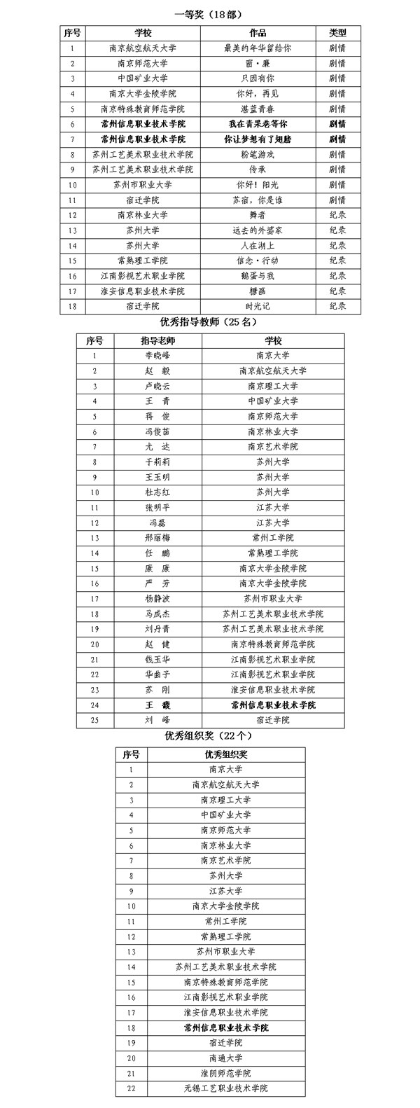 本次大賽由江蘇省教育(yù)廳(tīng)主辦,經組織專家(jiā)評審,共評出獲獎作品248部,其中特等獎11部、一等獎18部、二等獎41部、三等獎80部、優秀獎98部(bù)。評出(chū)優秀指導(dǎo)教師25名、優秀組織獎22個。