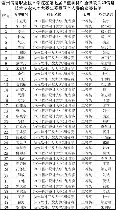 日前,第七屆“藍橋杯”全國軟件和信息技術專業人才大賽江(jiāng)蘇賽區個人賽成績揭(jiē)曉,我院軟件學院44名學生組成的代表隊參加了比賽。其中(zhōng)在“C/C++程序(xù)設計”高職組比賽中,獲得6個一等獎、8個二(èr)等獎、8個三等獎;在“JAVA軟件開發”高(gāo)職組比賽中,獲得7個一等獎、4個二等獎、3個三等獎。獲一(yī)等獎的13名同學將代表學院參(cān)加該大(dà)賽5月在北京舉行的全國總決賽。