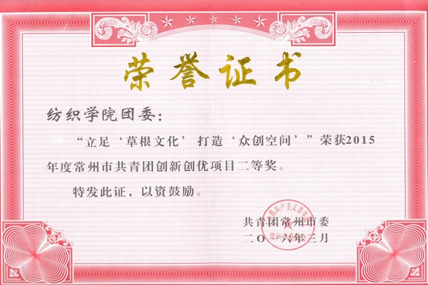 3月(yuè)23日(rì),共青團常(cháng)州市委十五屆四次(cì)全體(擴大)會議(yì)順利召開,會(huì)議(yì)總(zǒng)結了2015年常州(zhōu)市共青團工作,並部署了2016年的任務。在會議上,我院團委獲得“2015年度常州市優秀團委榮譽(yù)稱號,共青(qīng)團創新創優項目《立足草根文化(huà),打造眾創空間》榮獲常州市共青(qīng)團創新(xīn)創優(yōu)項目二等獎。