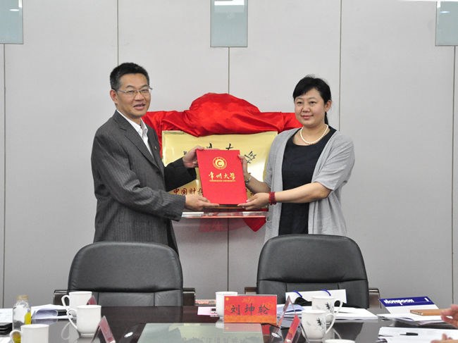 浦玉忠校長(zhǎng)向賈康教授(由(yóu)財政部(bù)財政科學研究所劉薇博士代)頒發聘(pìn)書