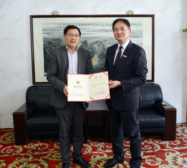 陳群副校長(zhǎng)向陳新仁教授頒發客座教授聘書