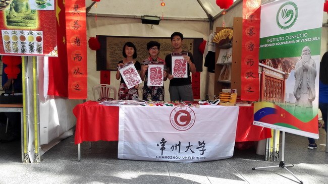 在委內瑞拉“春節迎新廟(miào)會”上,委內瑞拉外交(jiāo)部部長羅德裏(lǐ)格斯在中國駐委大使趙本堂的陪同下來到我校孔院師生(shēng)搭建的精美展台,觀看了代表中國傳統文化和(hé)江南水鄉(xiāng)特色的精美展品。雞(jī)年正好是羅德裏格(gé)斯部長(zhǎng)的本命年,孔院師生向羅德裏格斯部(bù)長贈送了一份雄雞圖案的中國剪紙。迎新廟會上(shàng)有近2000多位委內(nèi)瑞拉市民(mín)來展台前參觀。