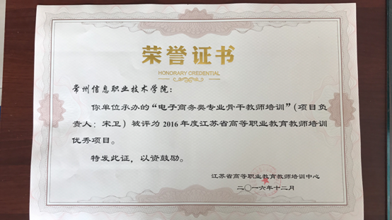 我院經貿管理學院2016年承辦的江蘇省高職院校電子(zǐ)商務類專業(yè)骨幹教師培訓考核優秀並被江(jiāng)蘇省教育廳師資培訓中心評(píng)為“2016年度江蘇省高等職業教育教師培(péi)訓優秀項目”。全(quán)省共有7個項目獲此殊榮。