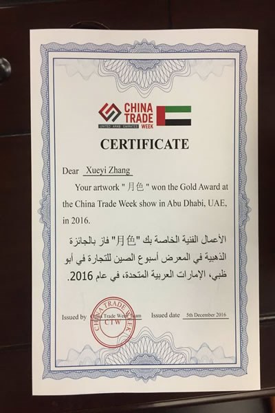 近日傳來喜訊,我院張學義老師的兩幅(fú)紮染作(zuò)品(pǐn)《月色(sè)》、《荷色》在(zài)沙特阿拉伯阿布紮比(bǐ)舉行的中國國際貿易周展(zhǎn)會上分別獲得金、銀獎。