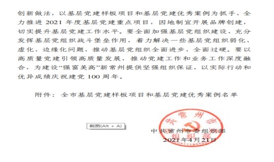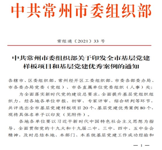 近日,中共常(cháng)州市委組織部印發(fā)《全市基層黨建樣板項目(mù)和基層(céng)黨建優秀案例的通知》(常組通〔2021〕33號),我校化工與製藥工程學院黨總支申報《紅色教育融入育人底色,打造學生黨員教育體係》案例獲(huò)評常州市基層黨建優秀案例。