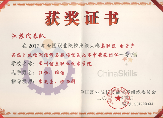 常州(zhōu)信息學院:我院師生獲2017年全(quán)國職業技能大賽電子產品芯片級檢測維修與數據恢複賽項一等(děng)獎