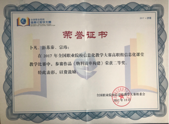 我院3個教師團隊在斬獲省賽佳績(jì)的基礎上,再接再厲,打磨作品,備戰本次大賽。備賽過程中,參賽團隊得到了學校各部門(mén)的大力支持。經過激烈角逐,經貿管理學院卜凡、彭蘇(sū)秦、宗瑋老師的《物料清單構建》作品榮獲高(gāo)等職業教育組信息化課堂教學二等(děng)獎;基礎部王丹老師的《計算(suàn)旋轉體的體積》作品榮獲高等職業教育組信息化課堂教學二等獎。在本次大(dà)賽閉幕(mù)式中,卜(bo)凡老師進行了獲(huò)獎作品展示,教育部職業教育與(yǔ)成人教育司王繼平司長(zhǎng)在(zài)隨(suí)後的閉幕(mù)式講話中對該作品給予了高度的肯定與評價。