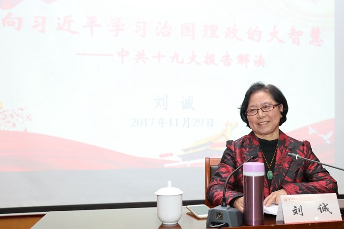 劉誠教授在報告中將十九大與七大、十二大進行類比,稱其為中共黨史的第三座裏程碑,凸顯了十九大的重要曆(lì)史地位,進而(ér)高屋建瓴,引經據典,從五個方麵詳(xiáng)述了習近平治國(guó)理政的大智慧(huì),她(tā)認為:十九大報告(gào)對國情發展階段的準確判斷,是治國理政的第一要義(yì);十九大報告是對過(guò)往五年的謀篇布(bù)局和對今後發展高屋建瓴的頂層設計;十九大報告體現了黨的指導思(sī)想與(yǔ)時俱進;十九大報告是戰略指(zhǐ)引,體現了中國共產(chǎn)黨治國理政的基本方略和主(zhǔ)要任務(wù)。