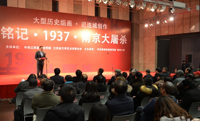 12月11日上(shàng)午,由中共江蘇省委宣傳部、江蘇(sū)省文學藝術界聯合會作為支持單位,中共常州(zhōu)市委宣傳部、常州大學主(zhǔ)辦的《銘記·1937·南京大屠殺》大型曆史組(zǔ)畫展(zhǎn)在江蘇省美術館(guǎn)成功舉行。中共江蘇(sū)省委外宣辦副主任楊力群,江(jiāng)蘇省(shěng)文聯副主席、巡視員楊企鵬(péng),全國中國畫學(xué)會副會長、江蘇省中國畫學(xué)會會長、江蘇省文聯副主席(xí)高雲,中國國(guó)家畫(huà)院國畫院副院長、江蘇省(shěng)書(shū)畫家(jiā)聯誼(yì)會會(huì)長、省美協名譽主席宋玉麟,常州市委常委、宣傳部部長、科教城黨工委(wěi)書記徐光輝,常州大學黨委書記程(chéng)純,常州大學校長陳群,常州大學黨委副書記、副校長陳奎慶,黑龍江省伊(yī)春(chūn)市委常委、宣(xuān)傳部長(zhǎng)遲寶旭,福建省畫院院長孫誌純,江(jiāng)蘇省美術館館長、省美協副主席徐惠泉,伊春市原副市長、組畫《銘記·1937·南京大屠殺》創作顧問李偉東,中國抗日戰爭史學會副會長、侵華(huá)日軍南(nán)京大屠(tú)殺遇難(nán)同胞紀念館原館長、組畫《銘記·1937·南京大屠殺》創作顧問朱成山及社(shè)會各界代表200餘人出席開幕式。