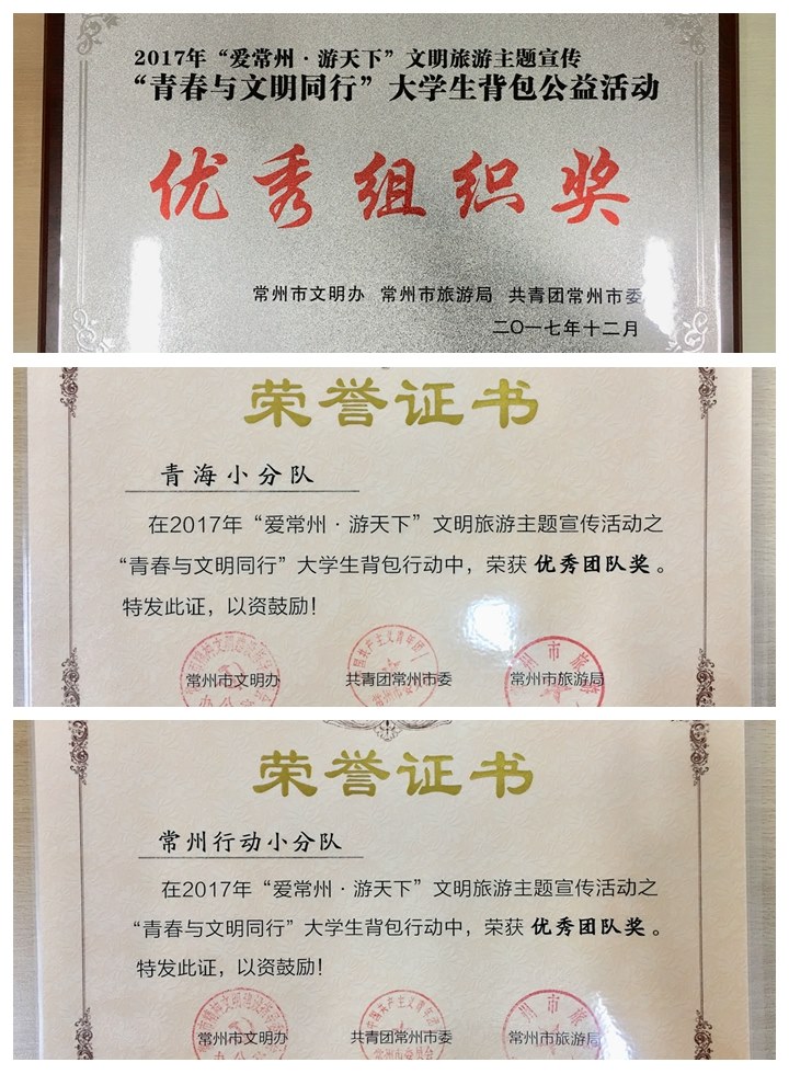12 月14日,從常州市文明辦、團市委、市旅遊(yóu)局傳來佳音,我(wǒ)院團委在2017年“愛常州、遊天下”文明旅遊主題(tí)宣傳活動暨“青春與文明同行”大(dà)學生(shēng)背包公益活動中榮獲最佳團隊獎和優秀組織獎。