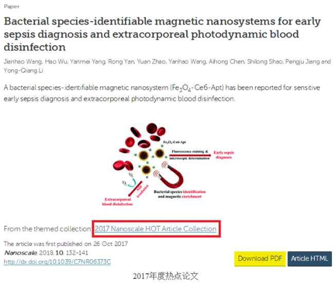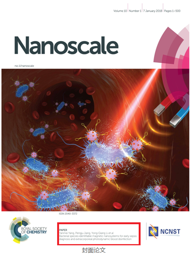 近日,國際納米材料著名期刊Nanoscale(SCI一(yī)區,影響因子7.367)在線發表了製藥與生命(mìng)科學學院(yuàn)王建(jiàn)浩副教授題為“Bacterial species-identifiable magnetic nanosystems for earlysepsis diagnosis and extracorporeal photodynamic blooddisinfection”(“基於(yú)磁納米顆粒複合體的膿毒症早期診斷與體外(wài)血液光動力滅菌”)的(de)研究(jiū)論文。該研究工作得到了審稿人(rén)的一致好評,並被選為當期的封麵論文(Outside Front Cover)及Nanoscale 2017熱(rè)點論文(2017 Nanoscale HOT Article Collection,全年2000多篇論文中共34篇入選),這是我校首次在Nanoscale發表生物醫學領域封麵論文。常州大學為該篇論文的(de)第一單位,我校兼職教(jiāo)授蔣鵬(péng)舉和蘇州大學醫學部李永強(qiáng)副教授為(wéi)共(gòng)同通訊作者。我校王建浩、蔣(jiǎng)鵬舉課題組長期從事納米生(shēng)物材料的合成及其(qí)在腫瘤靶向治療、抗菌(jun1)等領域的應用基礎研究(jiū),先後獲得科技部863計(jì)劃、國家自然基金青年基金、國際合作(zuò)與交流基金、麵上基金、海外及港澳學者合作研(yán)究基金等項目資(zī)助。