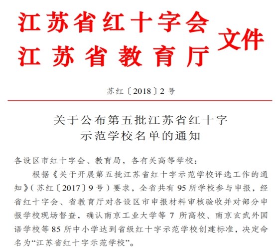 近日,江(jiāng)蘇省紅十字會和江蘇省教育廳(tīng)聯合發文公布了第五批省紅十字示範學校,我(wǒ)校榜上有(yǒu)名。