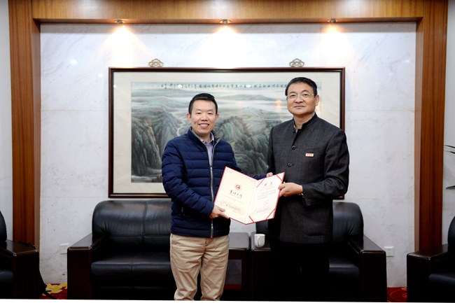 陳群簡要介紹了學校近年來(lái)的發展和專(zhuān)業(yè)特色,希望與馬薩諸塞大學在學生培養、教師交流、創新創業等方麵開展富有(yǒu)成效(xiào)的(de)合作與交流,並向駱雁頒發我校客座教授聘書。