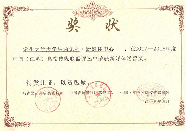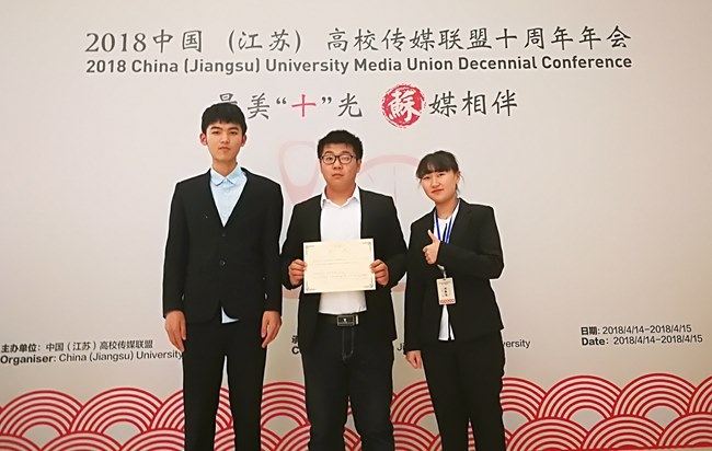 近日,2018年中國(江蘇)高校傳媒聯盟年會在西交利物浦大學召開,常州大學大學(xué)生通訊社·新媒體中心作為中國(江蘇)高校傳媒聯盟的理事單位,與(yǔ)聯(lián)盟會員媒體成員(yuán)、全省51家(jiā)高校的近120位校園(yuán)媒體代表一起參加此次會議。會議頒發了新媒體運營獎、十佳校園媒體獎等獎項(xiàng),我校大學生通訊社·新媒體中(zhōng)心繼2016年、2017年之後,再次(cì)獲中國(江蘇)高校傳媒聯盟新媒體運營獎,全省(shěng)共有(yǒu)10所高校校園媒體獲評此獎。