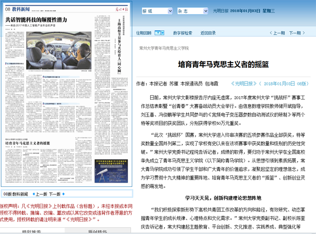 青年學生思想引(yǐn)領工作強化(huà)開展。構建了分層分類一體(tǐ)化思想引領工作體係(xì),完善了“圈層式”青年思想引領路徑,重點打造了踐行社會主義核(hé)心價值觀“五位一體”工作格局,開(kāi)展(zhǎn)了學習習近平新時代中國(guó)特(tè)色社會主義思想和黨的(de)十九大精神係列活動,成立常州大學青年馬克思主義學院,並成為團中央、團省委“班團一體化”工作改革試點單位。先(xiān)後榮獲(huò)“全省大中學生培育和踐行社會主義核心價值(zhí)觀活動先進單位(wèi)”、全國(guó)高校踐行社(shè)會主義核心價值(zhí)觀“示範團(tuán)支部”等榮譽。