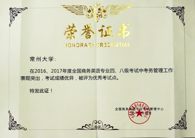 近日,全國商務英(yīng)語專業(yè)考試管理中心下發《關於表彰全國商(shāng)務英(yīng)語專業四(sì)、八級考試優秀考試點的通知》([2018]商英考字第1號),常州大學名列其中,成為全(quán)國10個優秀考點之一。