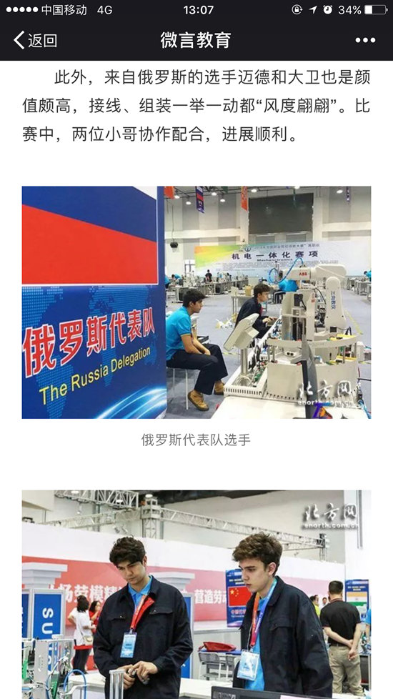 此次(cì)比賽中(zhōng),共(gòng)有來自中國(guó)、俄羅斯、巴基斯坦、印度等8個國家的選手同場競技,切磋機電一體化操作技術。我院兩位“高(gāo)顏值”帥哥一出(chū)場就吸(xī)引(yǐn)了眾多(duō)媒體的眼球,接線、組(zǔ)裝,一舉一動都配合默契,其優異表(biǎo)現受到了搜狐網、天津職業教育(yù)與成人教育(yù)網、微言教育(教育部政務新媒體)等多家媒體的關注。