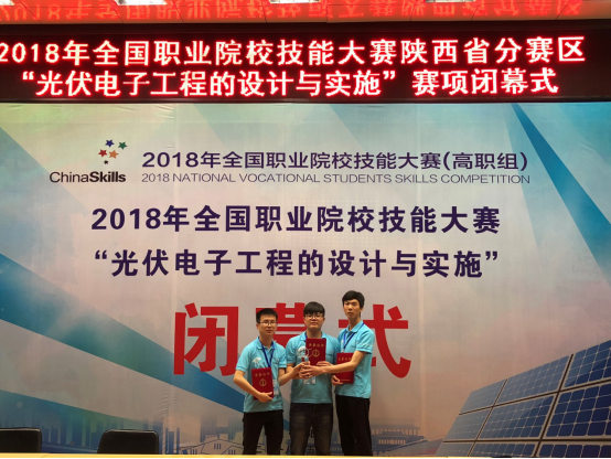 5月20日上午,2018年全國職業院校技能大(dà)賽高職組光伏電子工(gōng)程的設計與實施賽項決賽在陝西鹹陽舉行(háng),我(wǒ)校電子與電氣工程學院羅錦宏、朱文傑、王海波、餘文榮教(jiāo)師團隊指導的靳凱、徐建(jiàn)廣(guǎng)、於聰(cōng)三位學生以總分第5名獲得該賽項一等獎,為學校斬獲2018年(nián)全國職業院校技能大(dà)賽(sài)的第二枚金牌。