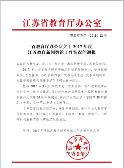 日(rì)前,江蘇省教育廳(tīng)辦(bàn)公室下發(fā)了(le)《關於(yú)2017年度江蘇教育新聞輿論工作情況的通報(bào)》(蘇(sū)教廳辦函(hán)〔2018〕12號),根據2017年度宣傳工作積分(fèn)情況,對6個設區市教育局、20所本科院校、20所高職(專科)院校予以表(biǎo)揚。我校獲評2017年度江蘇省教(jiāo)育新聞輿論工作表揚(yáng)單位,我校年度宣(xuān)傳工作積分在江蘇省高職院校排名中,從2016年度的第九名上升至2017年度的第(dì)五名。這是我校繼去年獲評2016 年度江蘇教育新聞工作表揚單位後(hòu)在新聞宣(xuān)傳領域取得的又一成果。