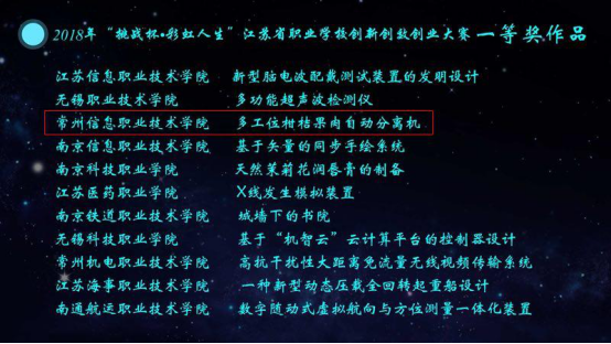 6月8日-10日,由團省委、省教育廳、省人力資源和社(shè)會保障(zhàng)廳(tīng)、省(shěng)科學(xué)技術(shù)協會、省學生聯合會共同(tóng)主辦的2018年“挑戰杯-彩虹人生”江(jiāng)蘇省職業學校創新(xīn)創效(xiào)創(chuàng)業大賽(sài)決賽在南通航運職業技術學院舉行。本次大賽分中職組和高職組兩個參賽組別,設創意設計競賽、生產工藝革新與工作流(liú)程優化(huà)競賽兩大類。來自全省62所職業學校近600人經複賽評審遴選參加了大賽,共有130個項目參加了角逐,高職(zhí)組有7件作品獲特等獎。