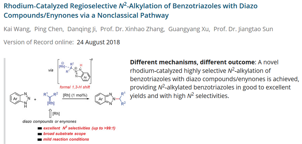 N2-烷基化的苯並三氮唑組分廣泛存在於多種藥物分子中,但(dàn)由於苯並三氮唑存在1-H和2-H異構體,其直接烷基化一般以N1-烷基化產物為主。所以苯(běn)並三氮唑的(de)選擇性N2烷基化反應一直是極具挑戰性的難題。孫江濤教授課題組選用立體位阻較大的銠催化劑成功地高選擇性地實現了苯並三氮唑的N2烷基化反應。理論計算證實了反(fǎn)應(yīng)機理為非常規的1,3-H遷移。