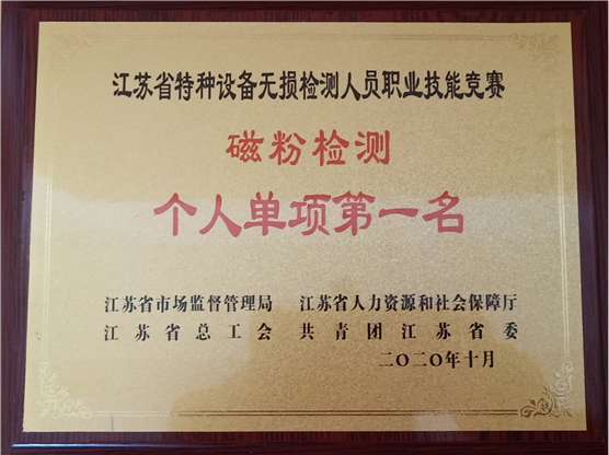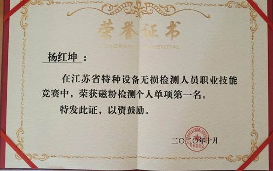 10月27日-30日,江蘇省特種設備無損檢測人員職業(yè)技能競賽在南京舉行。競賽由江(jiāng)蘇省市場監督管理局(jú)、江蘇(sū)省人力資源和社會保障廳、江蘇省總工會、共青團江蘇省委聯合主辦(bàn),江(jiāng)蘇省特種設備(bèi)安全監督檢驗研究院負責承辦,來自全省特種設備行業13支市級代表隊(duì)65名選手同場競技,經過公開、公平、公正的競(jìng)爭考核,我校理化測試與質檢技術專業(原無損檢測技術(shù)專業)2017屆畢業生(shēng)、南京金(jīn)鑫檢測(cè)工程責任(rèn)有限公司無(wú)損檢測員——楊紅坤榮獲磁粉檢測個人單(dān)項第一名,並被江蘇省人社廳授予“江蘇省技(jì)術能手”、被共青團江蘇省委授予“江蘇省青年崗位能手”(證書待發(fā))榮譽稱號。
